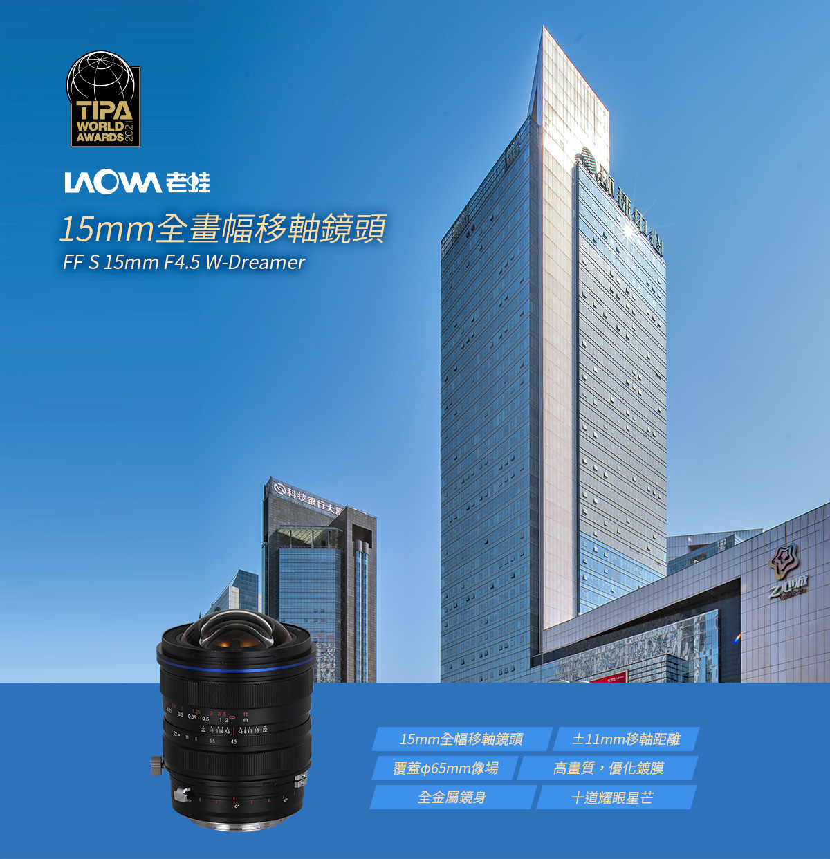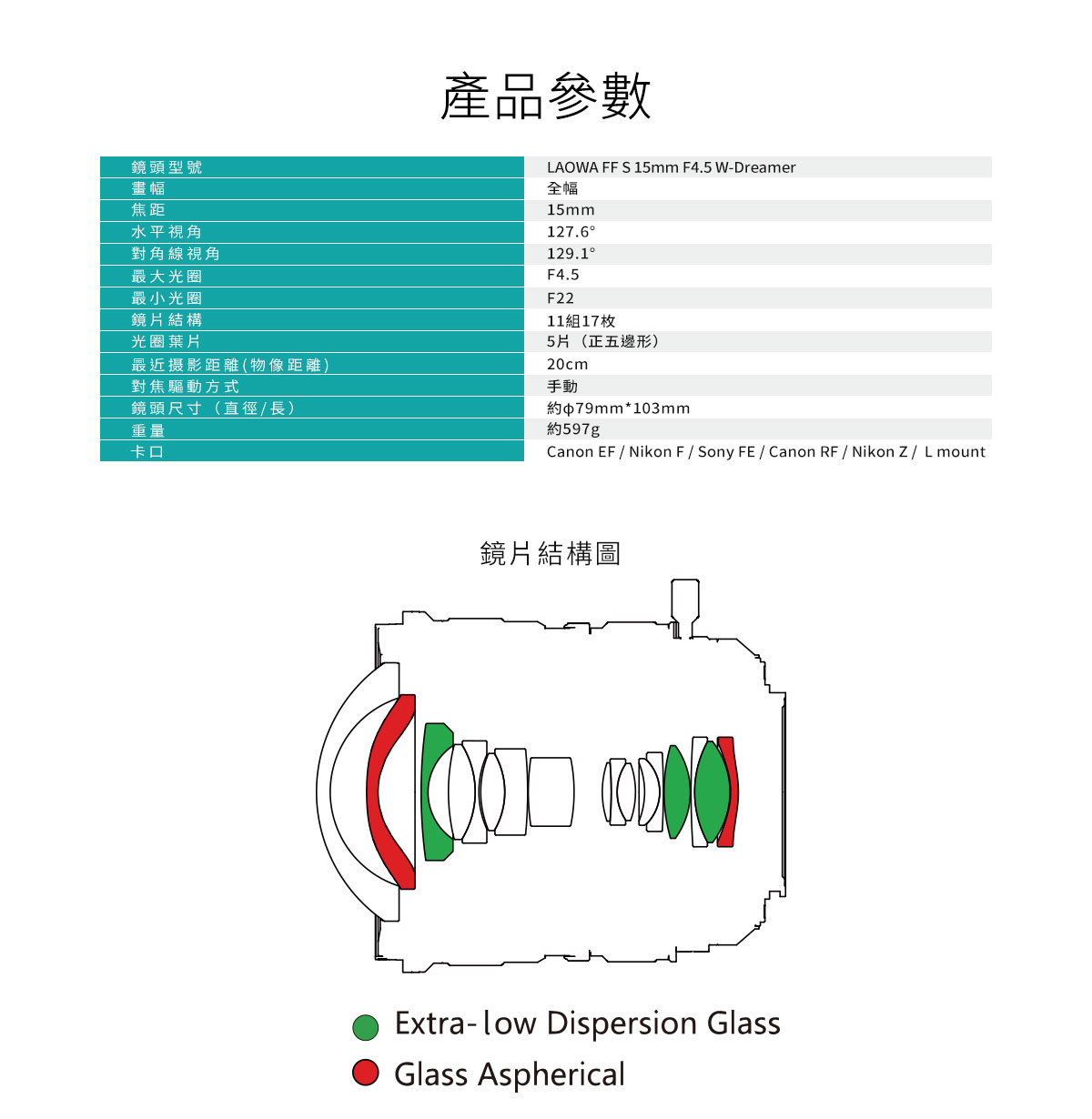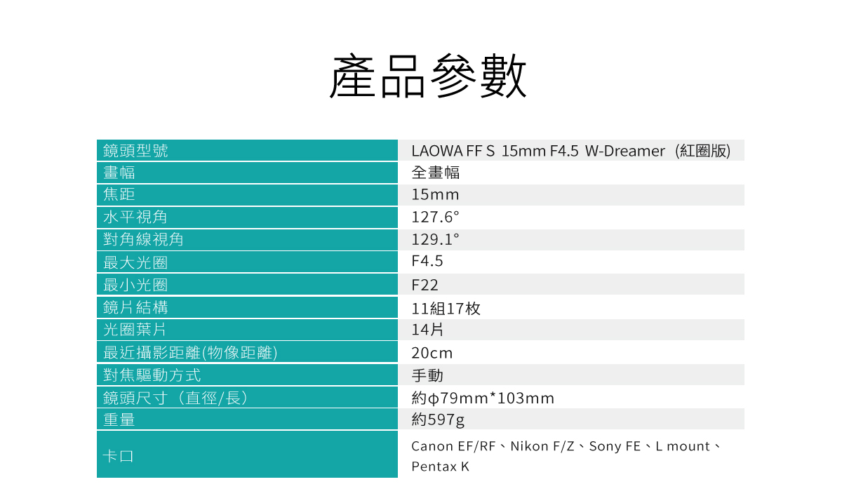 鏡頭型號:LAOWA FF S 15mm F4.5 W-Dreamer 畫 幅:全畫幅 焦 距:15mm 水平視角:127.6° 對角線視角:129.1° 最大光圈:F4.5 最小光圈:F22 鏡片結構:11組17枚 光圈葉片:5片(正五邊形) 最近攝影距離(物像距離):20cm 對焦驅動方式:手動 鏡頭尺寸(直徑/長):約φ79mm*103mm 重 量:約597g 卡 口:Canon EF / Nikon F / Sony FE / Canon RF / Nikon Z / L mount