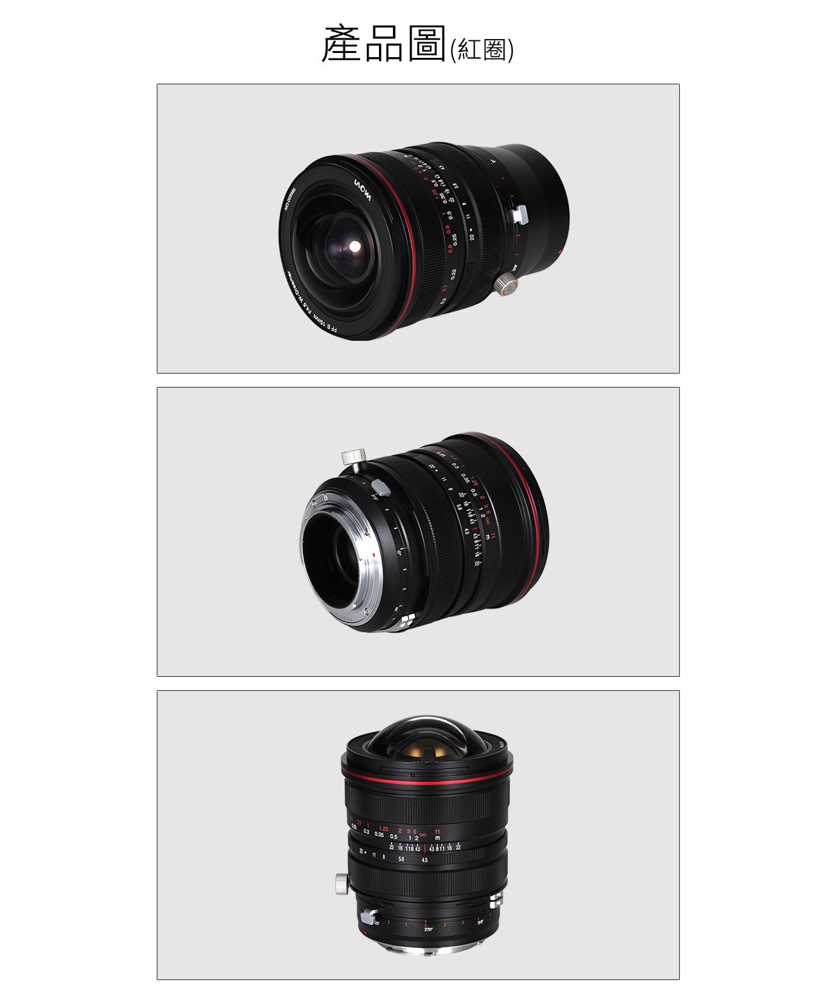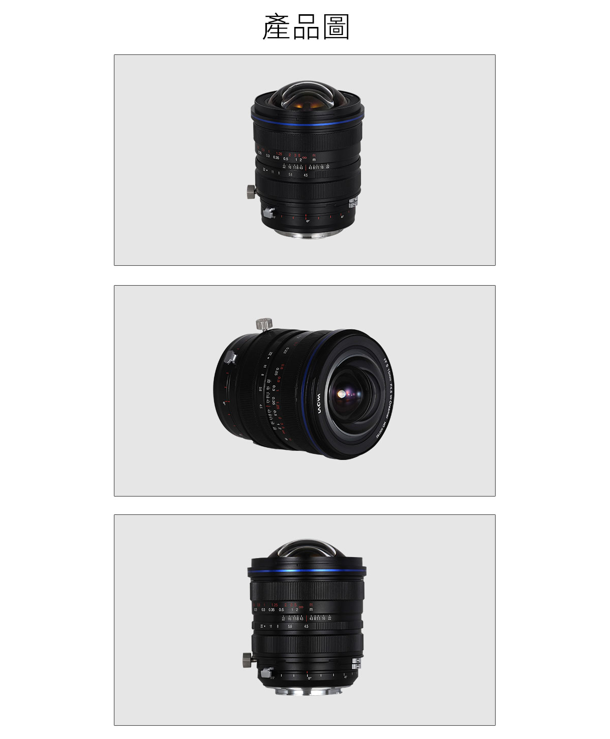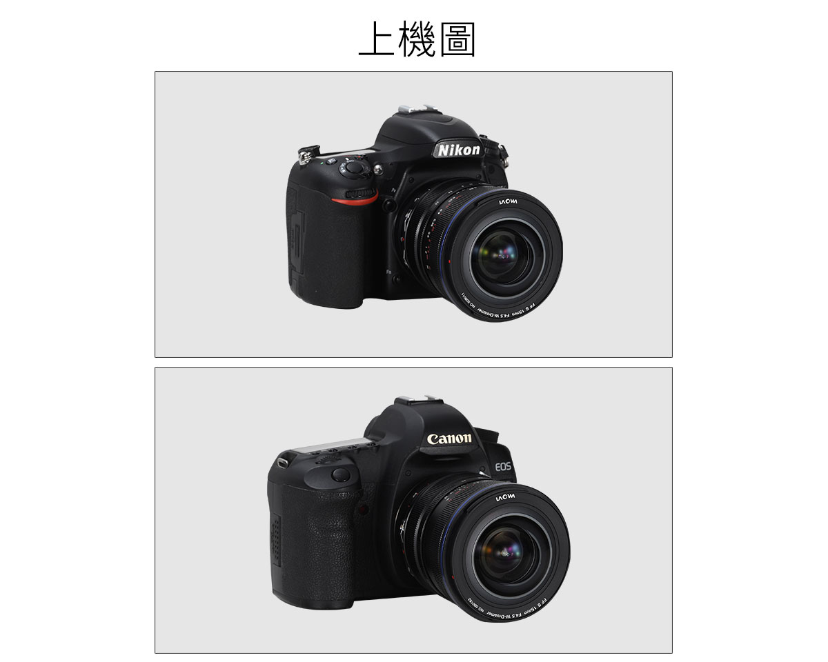 鏡頭型號:LAOWA FF S 15mm F4.5 W-Dreamer 畫 幅:全畫幅 焦 距:15mm 水平視角:127.6° 對角線視角:129.1° 最大光圈:F4.5 最小光圈:F22 鏡片結構:11組17枚 光圈葉片:14片 最近攝影距離(物像距離):20cm 對焦驅動方式:手動 鏡頭尺寸(直徑/長):約φ79mm*103mm 重 量:約597g 卡 口:Canon EF / Nikon F / Sony FE / Canon RF / Nikon Z / L mount