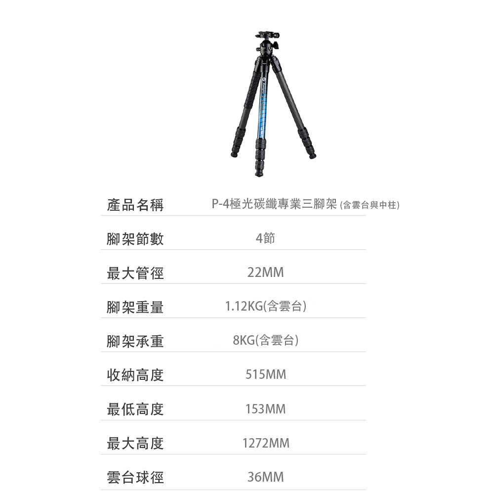 P-4 極光碳纖專業三腳架套組 (含雲台、中柱)