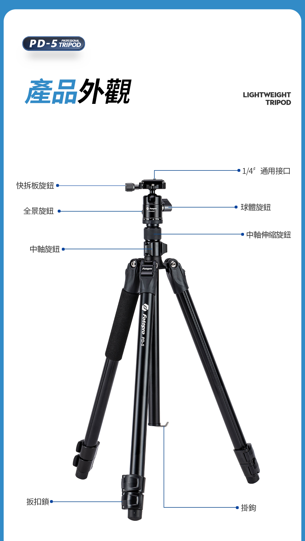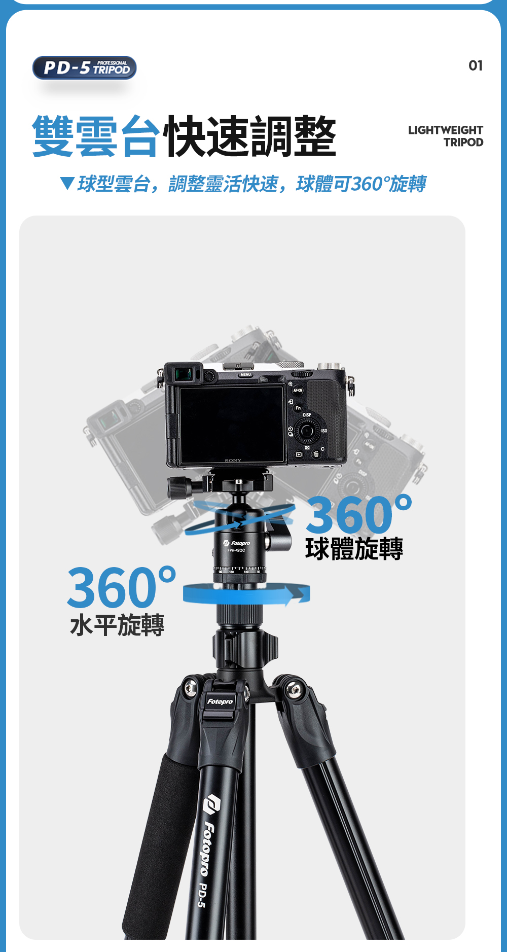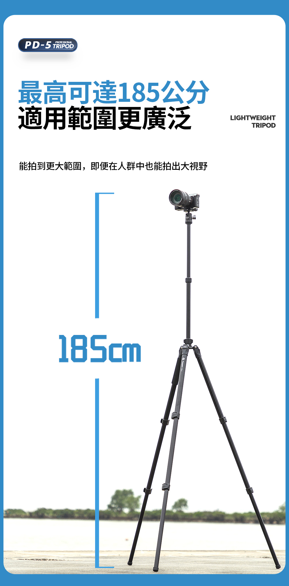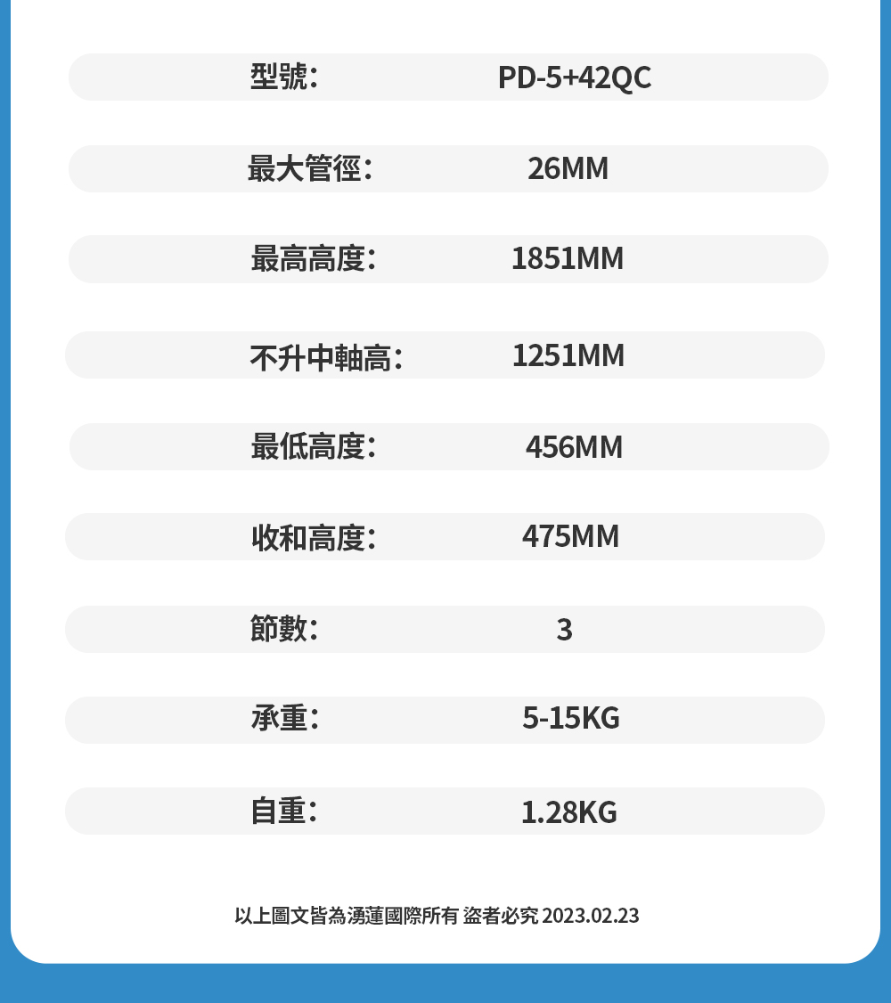 型號:PD-5 + 42QC重量:1.28KG最大管徑:26mm主要材質:鋁合金最高高度:1851mm不含中柱升高高度:1251mm最低高度:456mm收納高度:475mm節數:3雲台承重:5-15kg腳架承重:15kg
