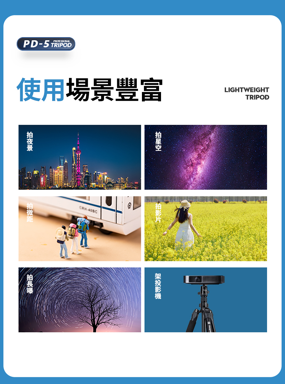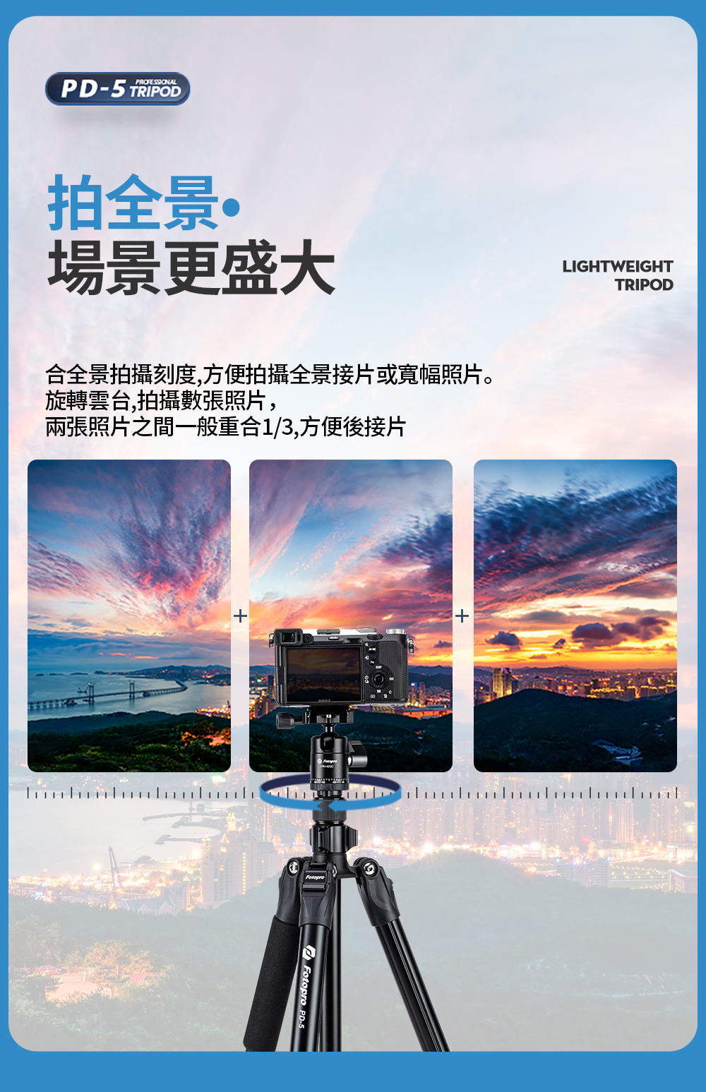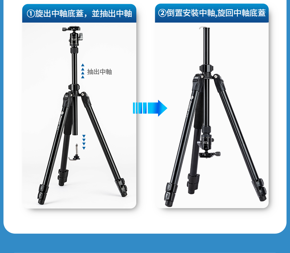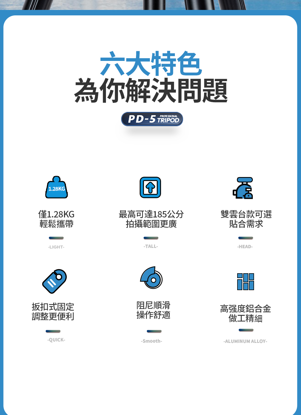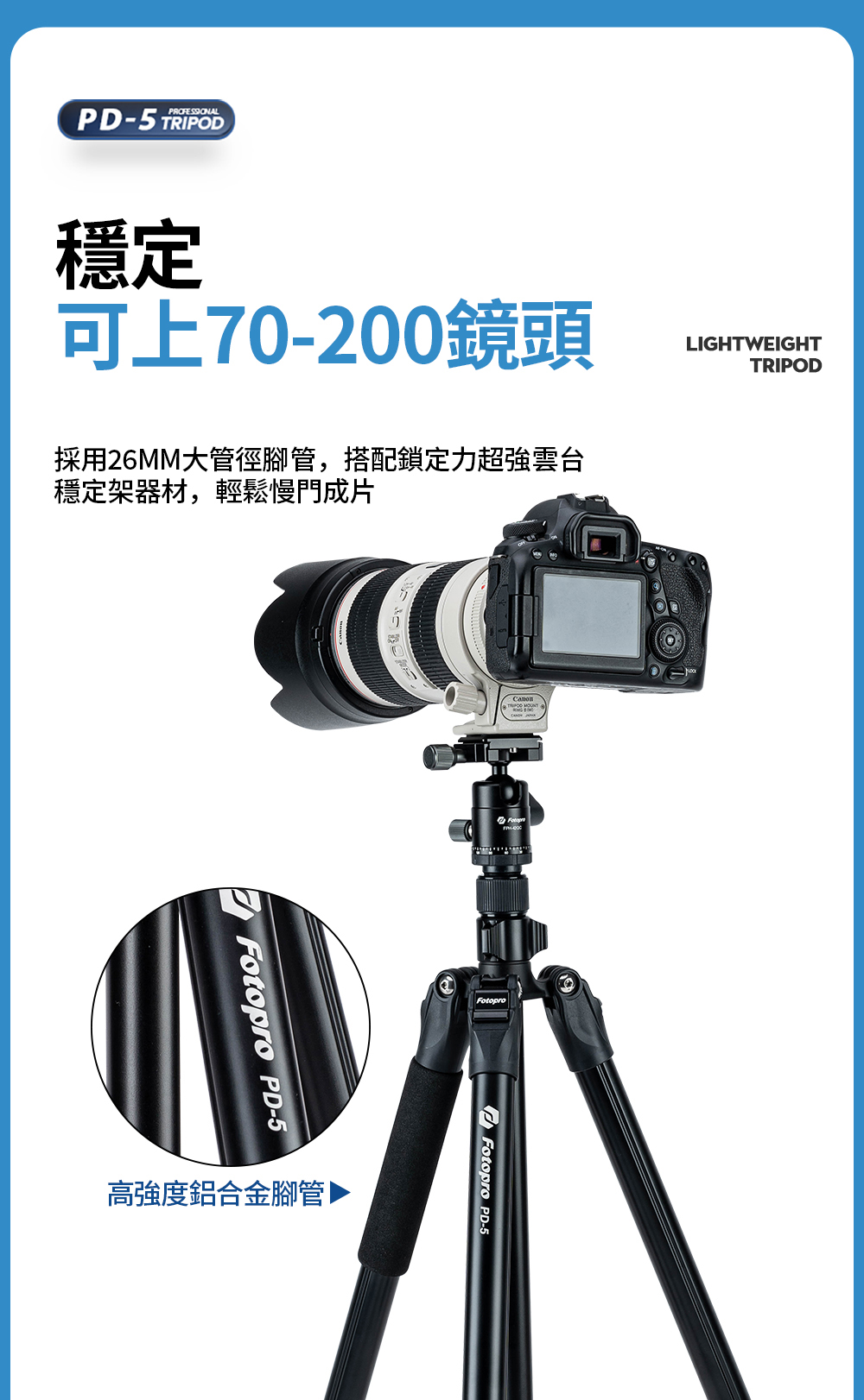 型號:PD-5 + 42QC重量:1.28KG最大管徑:26mm主要材質:鋁合金最高高度:1851mm不含中柱升高高度:1251mm最低高度:456mm收納高度:475mm節數:3雲台承重:5-15kg腳架承重:15kg