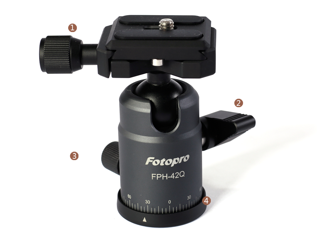 1.快拆版旋鈕 2.雲台旋鈕 3.水平旋鈕 4.水平儀