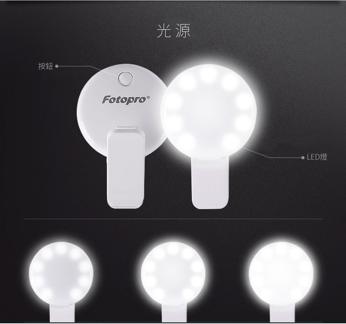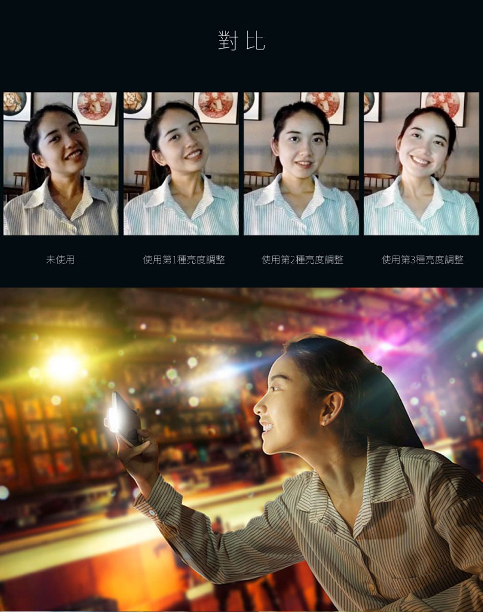 輕觸按鈕,3種亮度調整,9顆LED立體補光