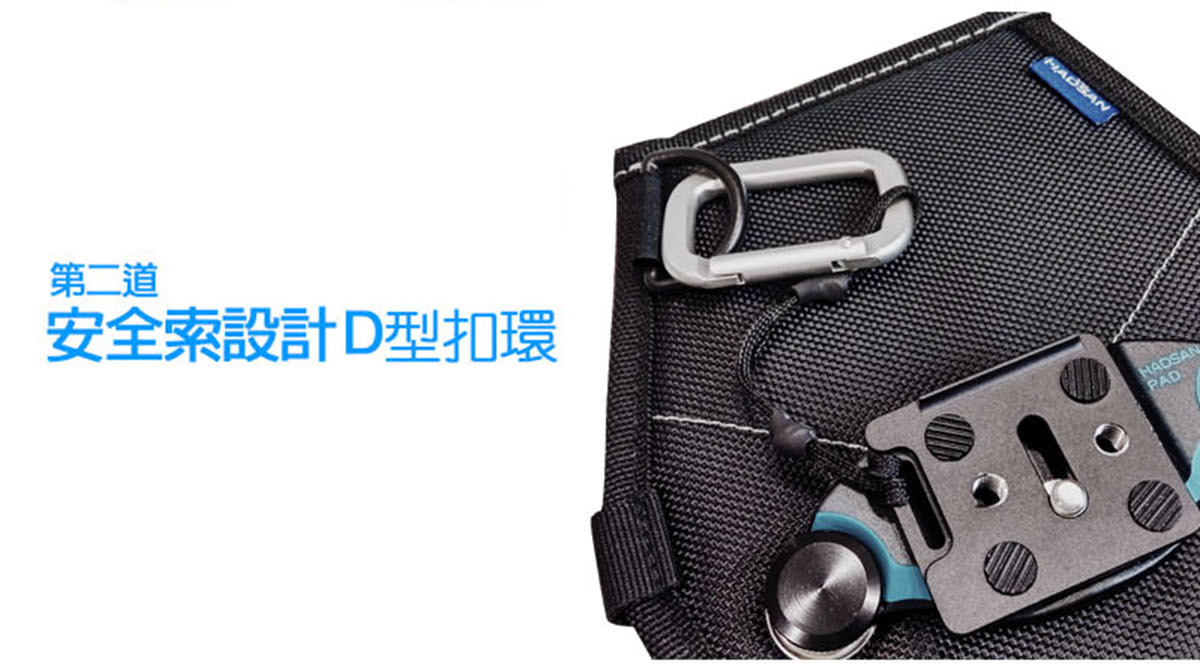 為提供更全面性的安全設計,第二代[快槍手槍套]在設計上,溶入了登山攀岩中,常用到的生命之鎖-D型鉤環概念,使用者可以將商品中,所附贈的D型扣環,安裝在快拆板上所預留的孔洞,再將D型扣環扣在快槍手槍套上增加第二道安全保障
