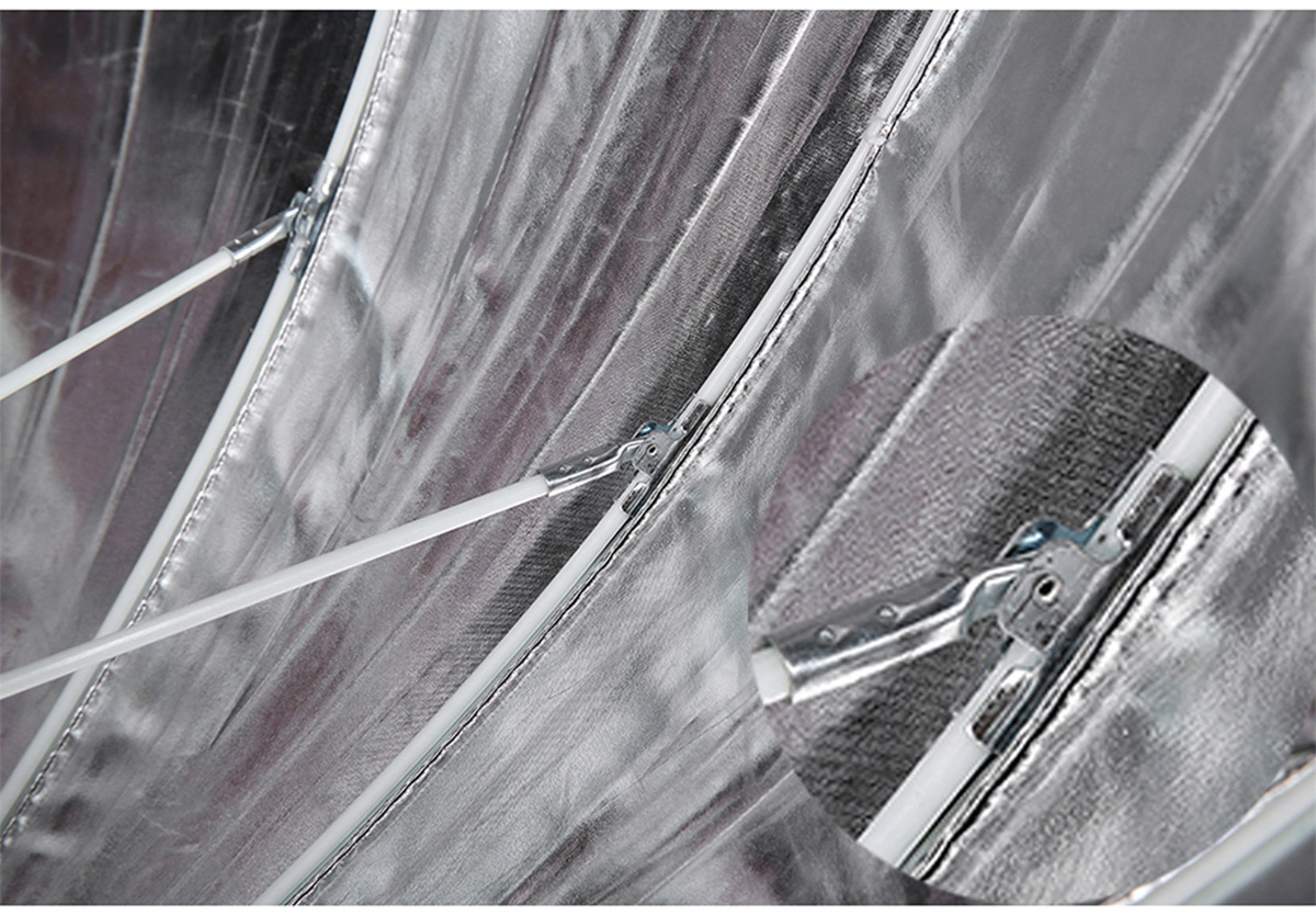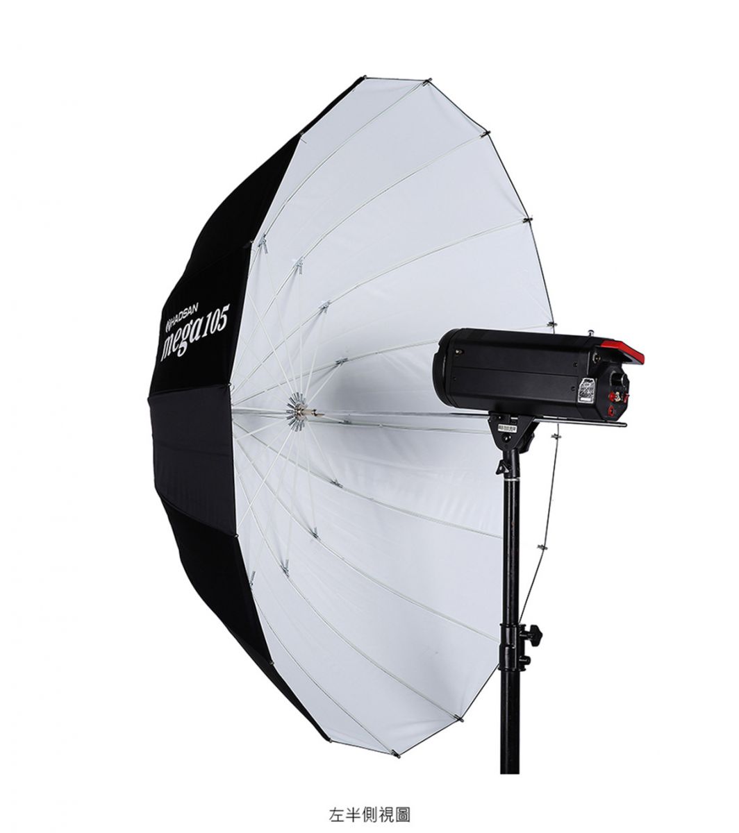 深型的設計可更好地控制光走勢,非常輕巧好攜帶。16根彈性玻璃纖維傘骨設計讓圓弧撞更均勻的光擴散,使用簡單。另採用美國高品質耐熱的符合布料;金屬均表面處理以防生鏽和變色。主結構傘骨的專利強化更耐用,可選購更柔和、更均勻的柔光罩,傘骨與主幹結合處採用特殊鋼材串接及特殊防鏽處理
