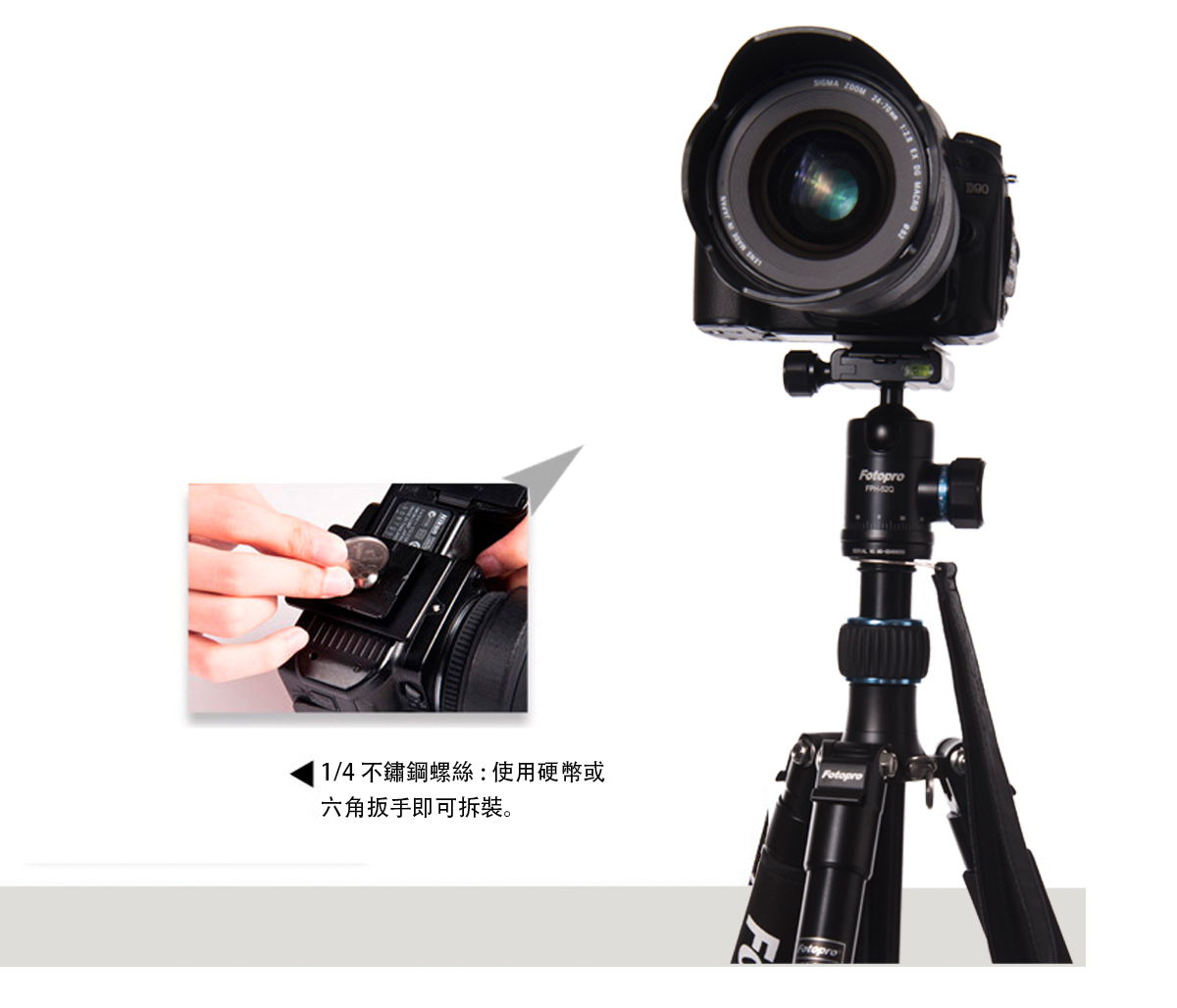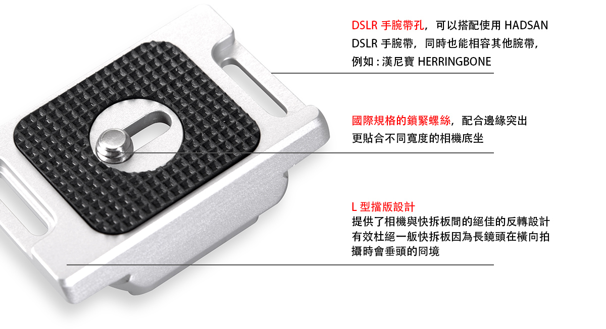 HADSAN 快槍手標配的快拆板為Arca Swiss規格,通用於夾扣式結構的雲台, 並且可以完美相容於目前大多數中高等級三腳架所搭配的雲台, 包括但不局限於FOTOPRO、Markins、RRS、岡仁波齊、晟威,百諾,思銳,等