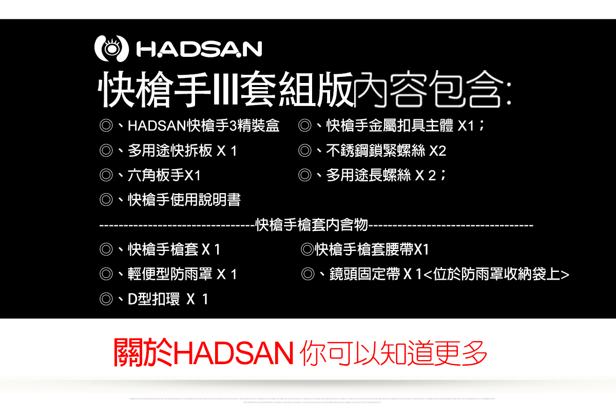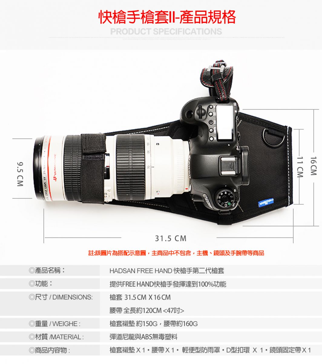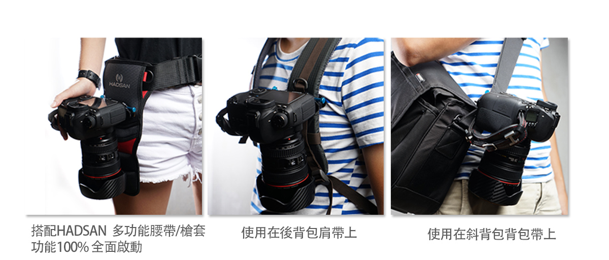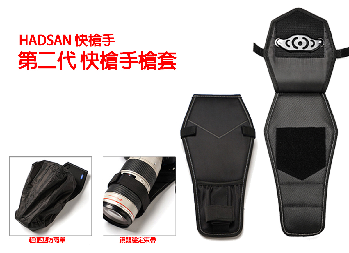 全新版的快槍手槍套保留原有的舒適性和安全性及保護性 在全新第二代升級版中,獨具匠心的設計,增加了許多便用功能。掀蓋式快槍手安裝座,內層採用了大面積魔鬼氈面,提供更便利的安裝方式,也提使用者更快速的將腰帶安裝上槍套 並且在背面增加二條魔鬼氈的安全帶提供更安全的保險。輕便型防雨罩與收納空間,為方便戶外攜帶使用在減壓槍套襯墊背面增加了輕便型防雨罩收納空間 ,HADSAN快槍手輕便型防雨罩可容納24-70、70-200這類的大小鏡頭 註:新版快槍手II-槍套內附輕便型防雨罩