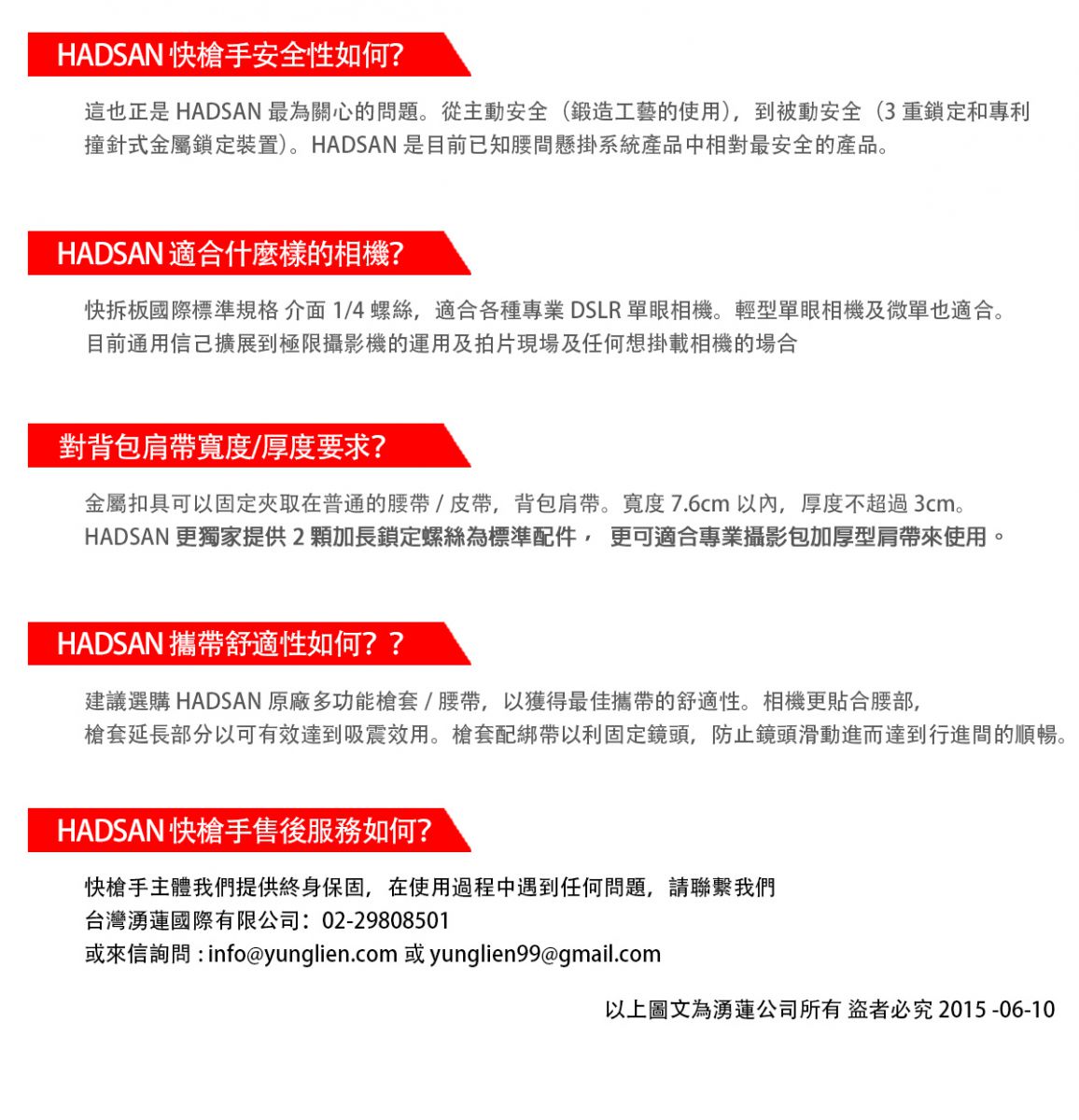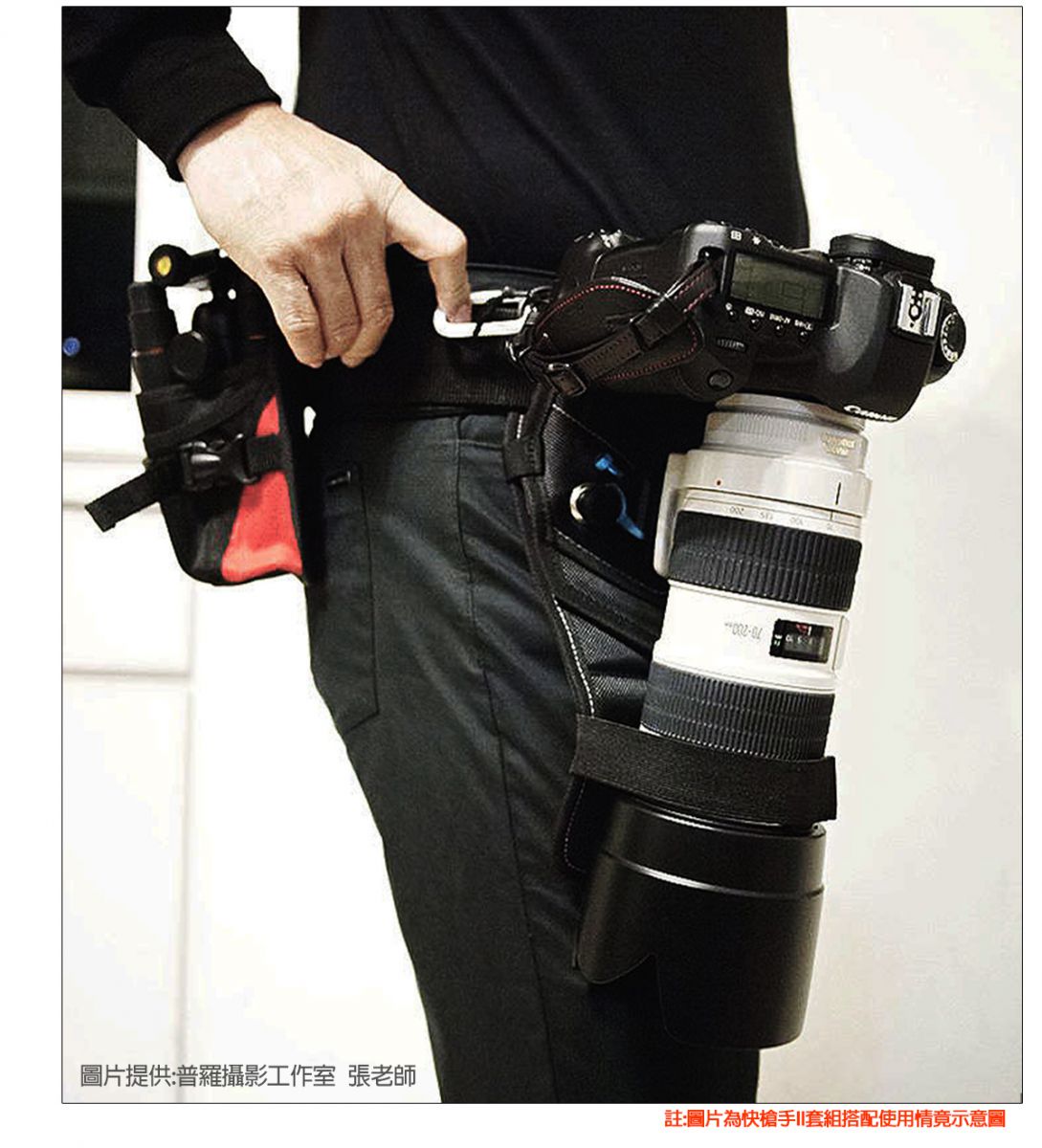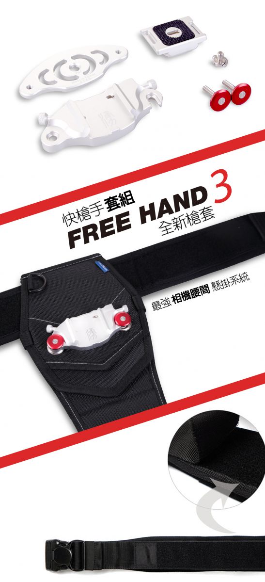 全新版的快槍手槍套保留原有的舒適性和安全性及保護性 在全新第二代升級版中,獨具匠心的設計,增加了許多便用功能。掀蓋式快槍手安裝座,內層採用了大面積魔鬼氈面,提供更便利的安裝方式,也提使用者更快速的將腰帶安裝上槍套 並且在背面增加二條魔鬼氈的安全帶提供更安全的保險。輕便型防雨罩與收納空間,為方便戶外攜帶使用在減壓槍套襯墊背面增加了輕便型防雨罩收納空間 ,HADSAN快槍手輕便型防雨罩可容納24-70、70-200這類的大小鏡頭 註:新版快槍手II-槍套內附輕便型防雨罩