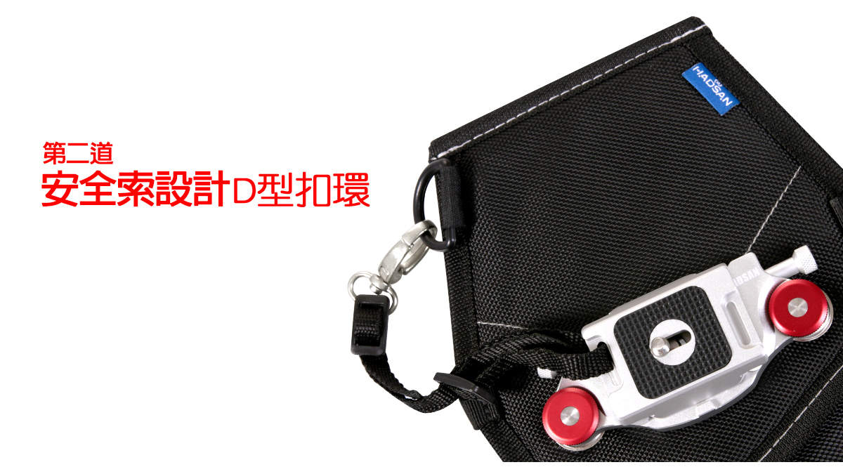 為提供更全面性的安全設計,第二代[快槍手槍套]在設計上, 溶入了登山攀岩中,常用到的生命之鎖-D型鉤環概念 使用者可以將商品中,所附贈的D型扣環,安裝在快拆板上 所預留的孔洞,再將D型扣環扣在快槍手槍套上 增加第二道安全保障