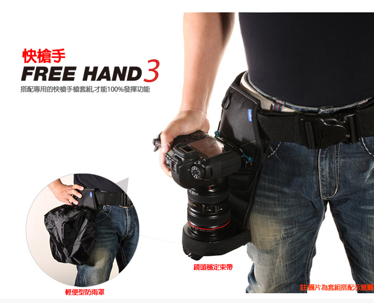 設計在防雨罩收納上的穩定束帶, 有效提供行在進中,可以讓鏡頭更穩定的 貼合在槍套襯墊上而不會亂晃