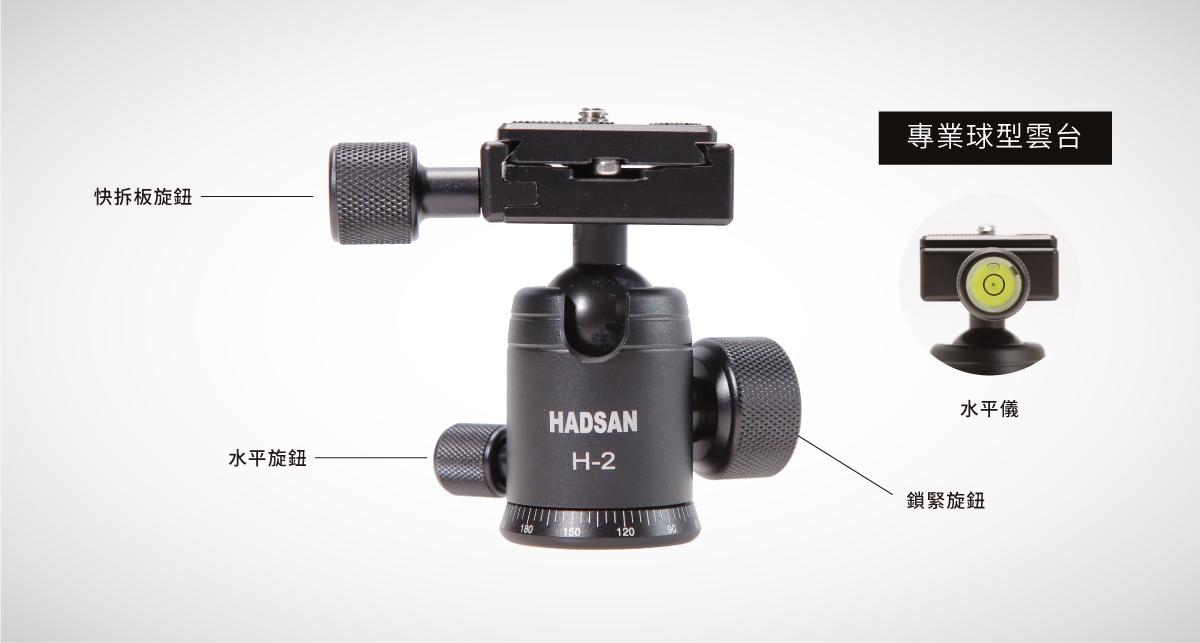 雲台旋鈕-調節阻尼球體鬆緊,控制球體多方向拍攝