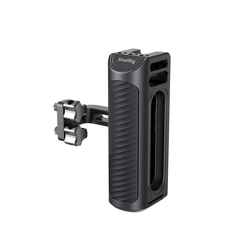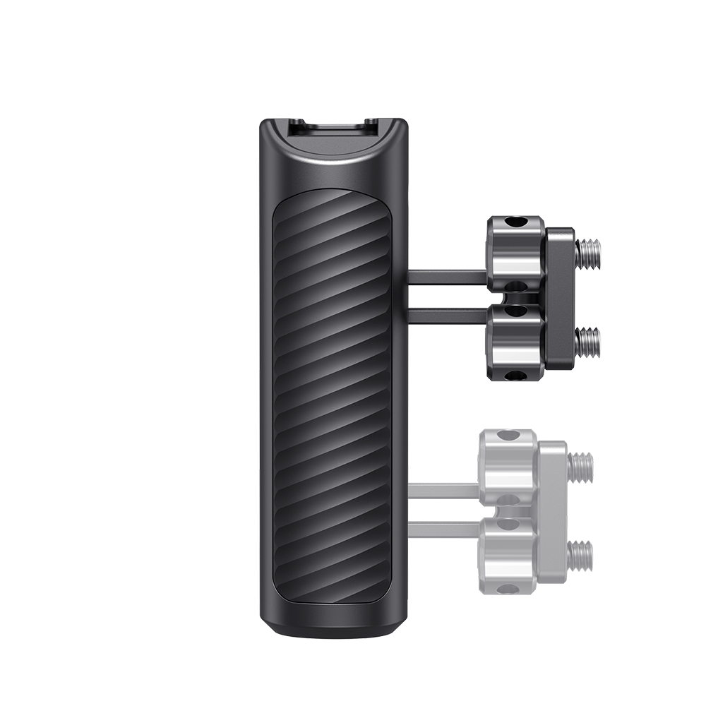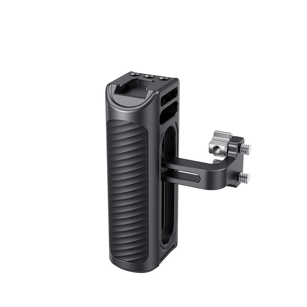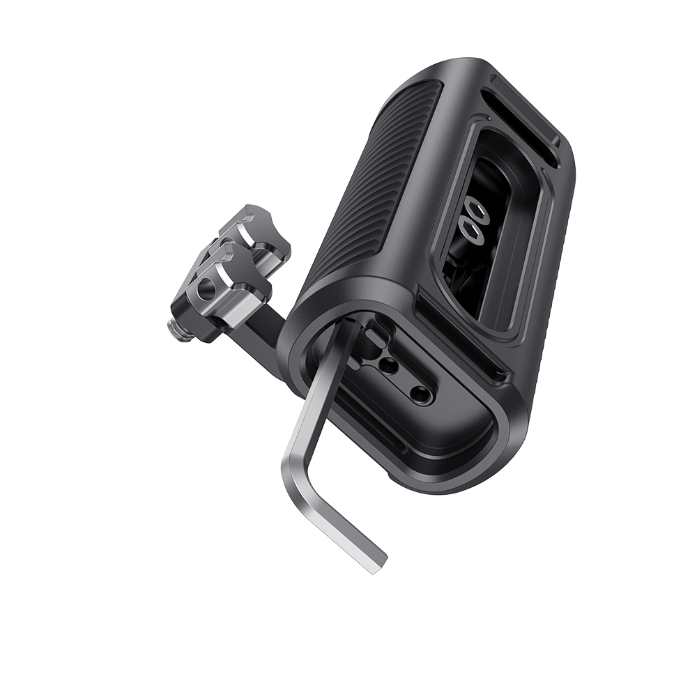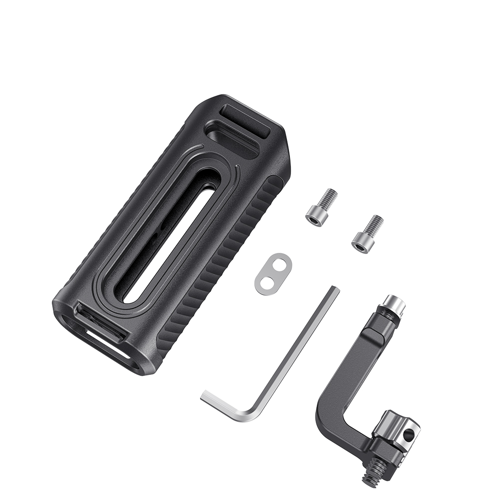 是為提供舒適的手持拍攝而設計。底部內置板手,可根據您的需要上下調節把手或更換於左右側。使用兩個1/4手擰螺絲將握把固定在錄影機左側或右側,並可通過內置L型扳手二次加固鎖緊。帶有一個冷靴和三個1/4螺紋孔,可安裝其他配件。採用鋁合金機身和防滑矽膠套,僅重220克,還可與手腕帶一起使用,提高安全性,提供舒適輕巧的手持拍攝。
