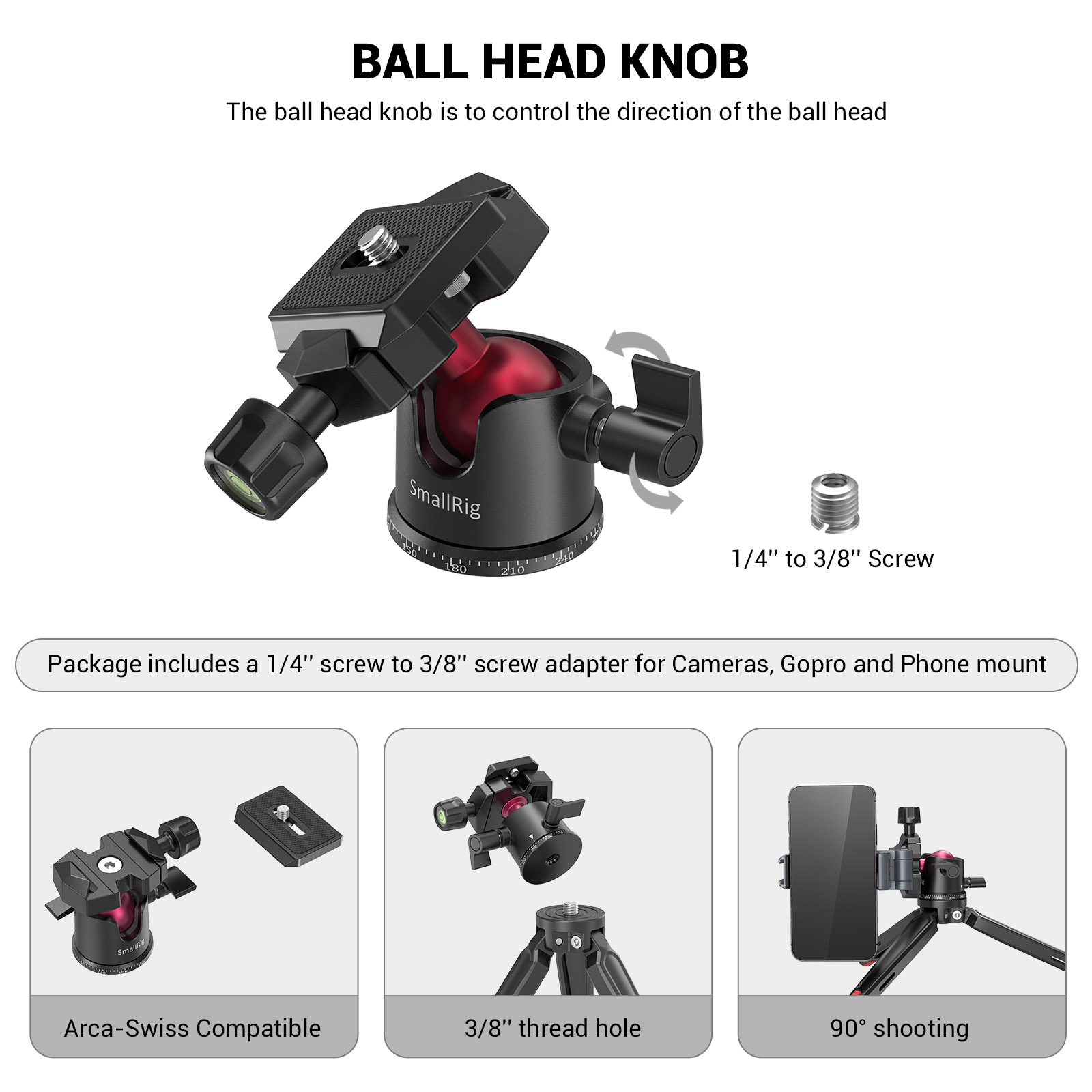 適用於無反相機、微單、手機、運動相機等,也可當手持拍攝握把。不帶球頭的三腳架可承重20kg,而球頭本身可承重2kg。橡膠墊片底腳可防滑。具有精確的刻度能校準,且球頭能夠360°旋轉進行全景拍攝,-90°/ + 45°前傾和-50°/ + 50°橫向傾斜以進行多角度調節,能夠水平和垂直切換拍攝。擁有Arca-Swiss快裝板,能夠快速拆卸設備。
