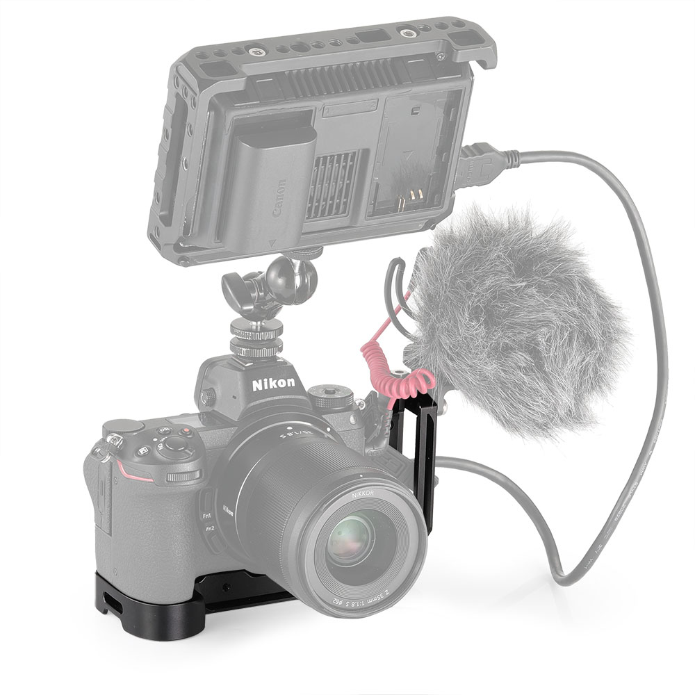 帶有抗扭旋鈕,可防止相機鬆脫。底板在原始握柄上增加了16.5mm的高度,能夠使握持時更加舒適。底板和側板均為Arca快拆板,使相機能進行垂直或水平拍攝。每個軸上都有一傳感器居中線,可將相機對準三腳架,不阻擋相機的電池倉和接口。如果需要更多空間用於拆裝線具,可以將側板向左延伸。底部隨附的六角扳手能快速拆裝L型支架。能與Peak Design手腕帶配合使用,於右側擁有一個手腕帶環。1/4冷靴安裝座1593。底板的正面配有兩個M4螺絲,用於FTZ安裝座2244,用以保護鏡頭。