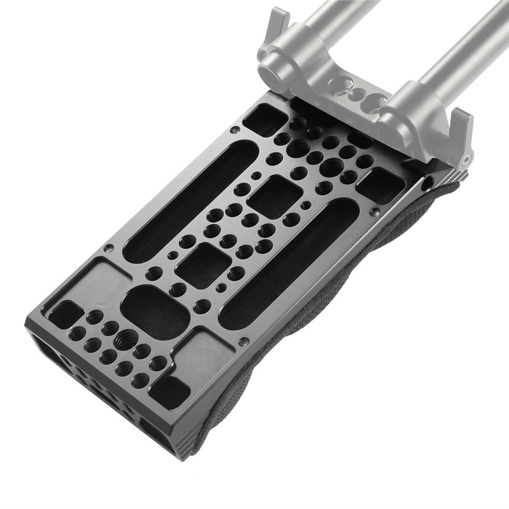 墊肩可通用不同尺寸大小的相機。還可用於大型攝影機,不影響其他配件連接。頂部配有許多1/4、3 / 8和M4螺紋孔,可用於安裝不同標準的快拆基座,例如Drop-In Baseplate(Manfrotto)2006,機動性高,能夠快速拆裝。還可連接15mm RailBlock 942,再連接15mm導桿1053和握把998,攝影過程中,可以調整平衡,使操作更加便利。肩部記憶海綿透過4個M4螺絲與鋁合金機身連結。記憶海綿柔軟有彈性,大幅度動作時能有效減緩肩膀不適。背面兩側的Arri定位孔可將魔術手臂與防旋轉轉接頭 2026連接在一起,支撐顯示器。後部的1/4螺紋孔可以連接15mm 導管底座 942和15mm導管1053,用來安裝電池後蓋1547和V-Lock組裝套件1846,放置大電池。正面的1/4螺紋孔可以安裝15mm 導管底座 942和手把 998,或安裝遮光罩。