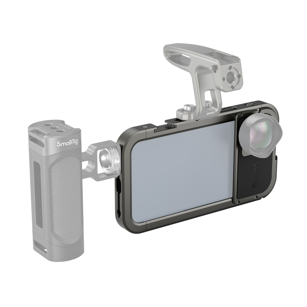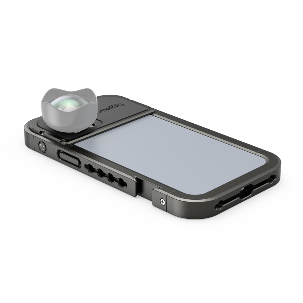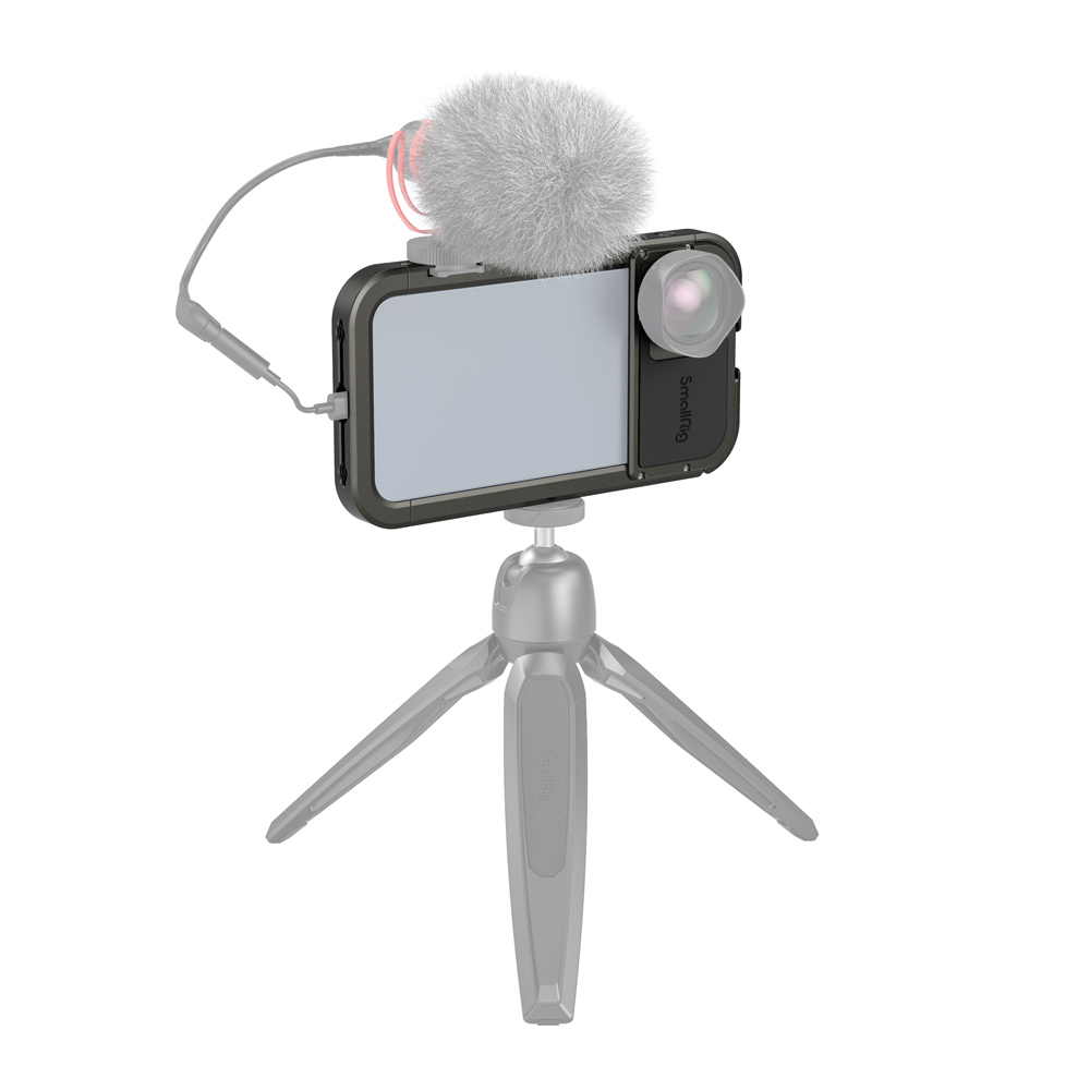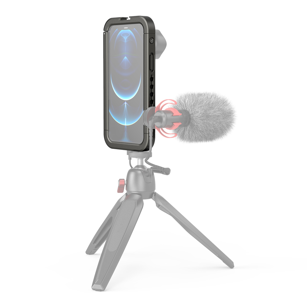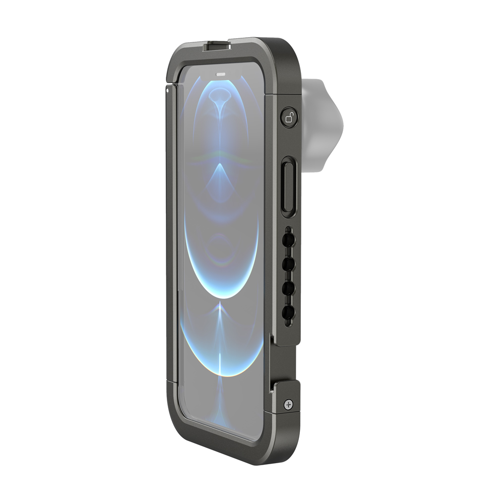 專為iPhone 12設計的多功能手機兔籠,能實現更高水平的手機攝影、攝像、採訪和電影錄製。兔籠帶有兩個冷靴座,可安裝麥克風和LED。在頂部,底部,左側和右側具有多個1/4螺紋孔,可根據需要安裝不同的配件,例如三腳架,側面手柄等。能夠水平和垂直拍攝相互切換。內置墊片有助於吸收震動並防止刮傷手機。背面的鏡頭座可以輕鬆地將外接鏡頭安裝至手機。快速鎖定設計可確保更緊密的貼合性,更安全,更穩定。