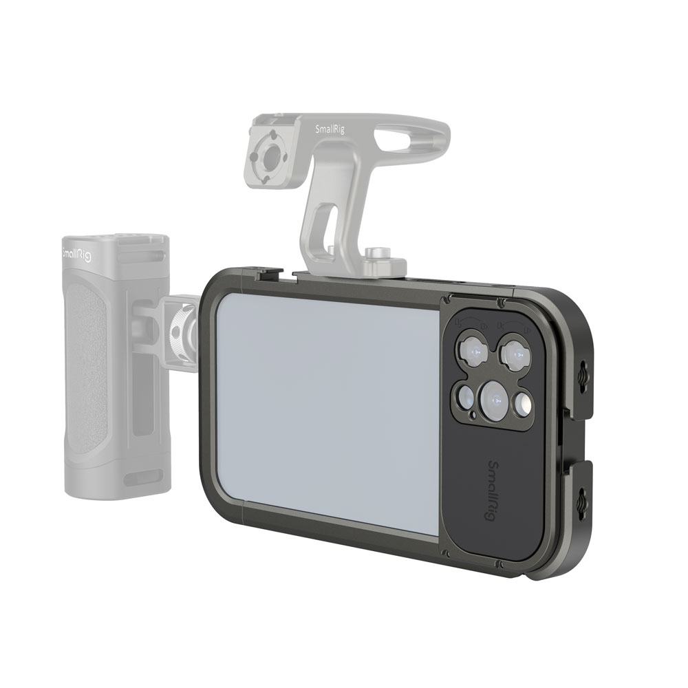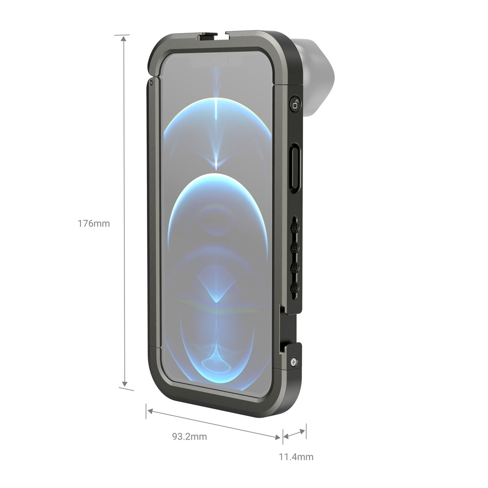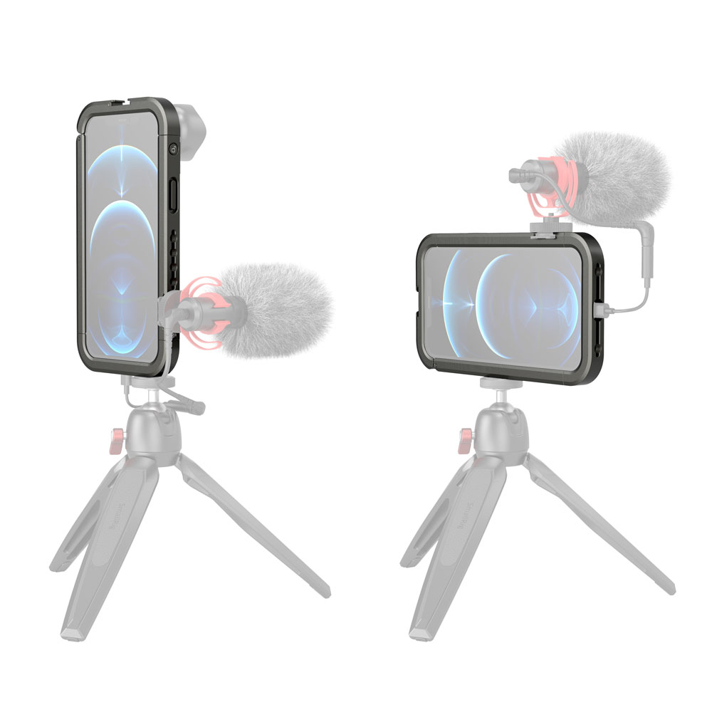 專為IPHONE 12 PRO MAX 設計的多功能手機兔籠,能實現更高水平的手機攝影、攝像、採訪和電影錄製。兔籠帶有兩個冷靴座,可安裝麥克風和LED。在頂部,底部,左側和右側具有多個1/4螺紋孔,可根據需要安裝不同的配件,例如三腳架,側面手柄等。能夠水平和垂直拍攝相互切換。內置墊片有助於吸收震動並防止刮傷手機。背面的鏡頭座可以輕鬆地將外接鏡頭安裝至手機。快速鎖定設計可確保更緊密的貼合性,更安全,更穩定。