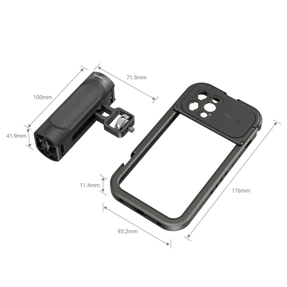 套組帶有專為iPhone 12 Pro Max設計的兔籠和側面握柄,可更穩定的進行手持拍攝。兔籠具有兩個冷靴座和多個1/4螺紋孔,可連接麥克風、LED燈、三腳架等配件。能水平、垂直拍攝隨心切換。背面的鏡頭座可以輕鬆地將外接鏡頭安裝到手機上。
